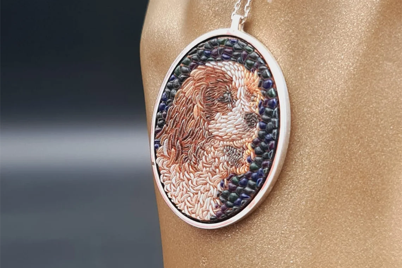 This exquisite necklace is made from high-quality silver and features a King Charles Cavalier dog depicted in an elegant mosaic pattern. Each piece is meticulously crafted and assembled with great care.